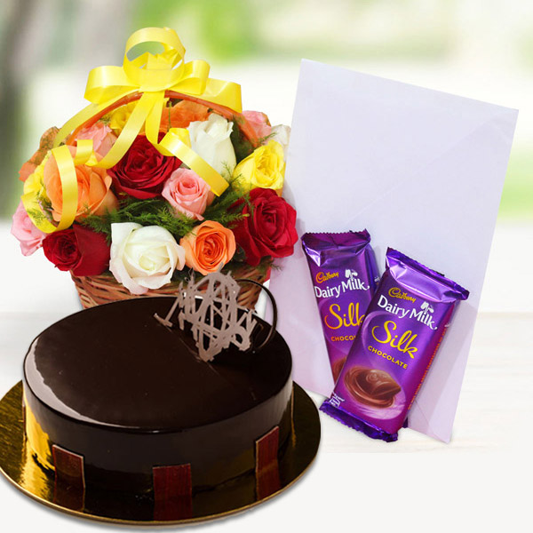 • Chocolate Truffle Cake and Yellow Roses Flower Basket: A Perfect Gift Combo
